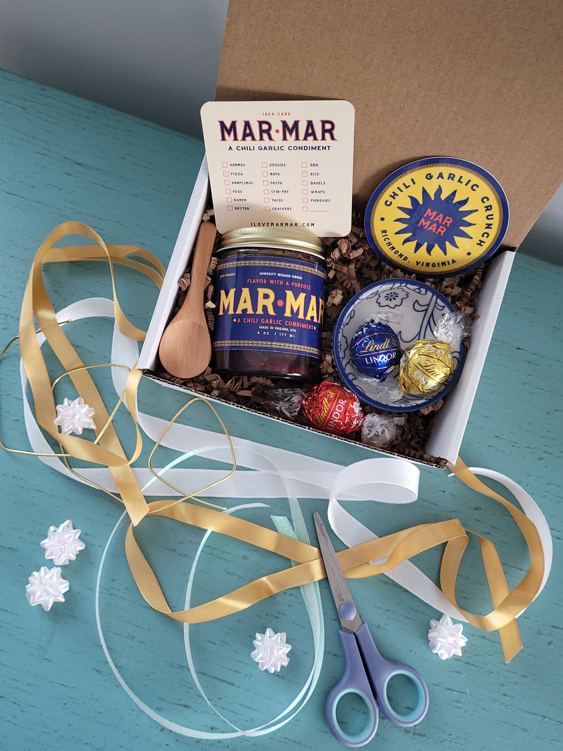 Your Gift Box will contain one (1) 6 ounce jar of Chili Garlic Mar Mar (Your choice of Original, Hot or Gluten Free. Note, Hot and Gluten Free not pictured.) and one (1) ceramic serving bowl with a wooden spoon and three (3) Lindor chocolates..